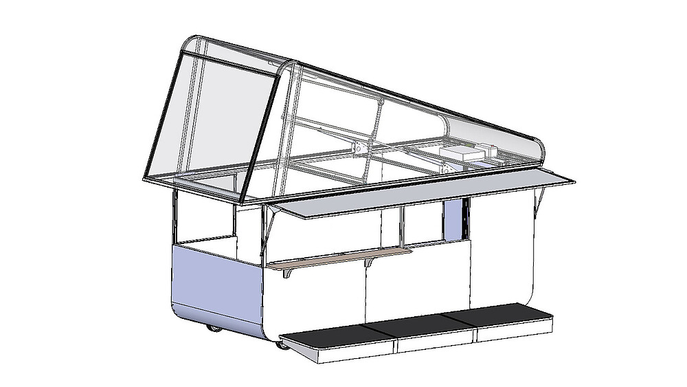 Zwei Module präsentieren die Vielfalt des Schweizer Käses: eines als Informationsstand, das andere als Verkaufspavillon. Die zusammenklappbaren Einheiten werden auf einem Tridem-Anhänger transportiert und verwandeln sich vor Ort hydraulisch zum vollwertigen Erlebnisstand.