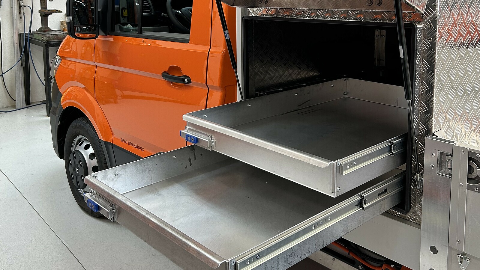 Kein Handwerk ist gleich. Deshalb bietet Wenger Ausbauten, die auf die Bedürfnisse des jeweiligen Gewerbes zugeschnitten sind. Regalsysteme, ausziehbare Schubladensysteme, Fächer und Halterungen sorgen für Ordnung und effiziente Abläufe. Alles hat seinen Platz und ist sofort griffbereit – ein Arbeitsplatz auf Rädern. Jedes Detail ist darauf ausgelegt, Arbeit zu erleichtern und Sicherheit zu gewährleisten.