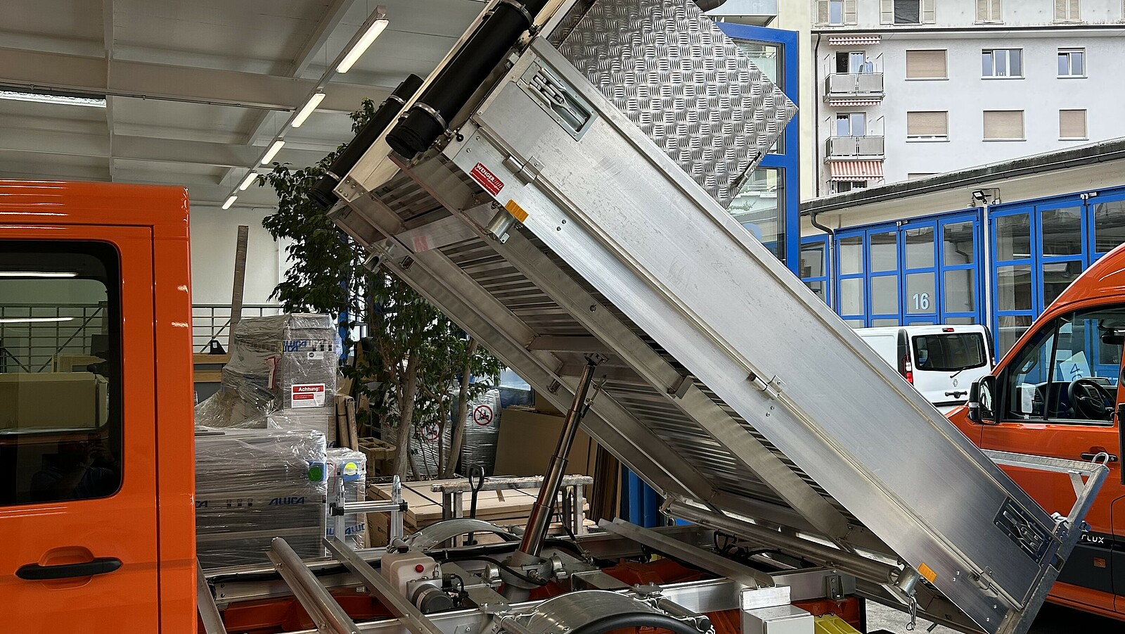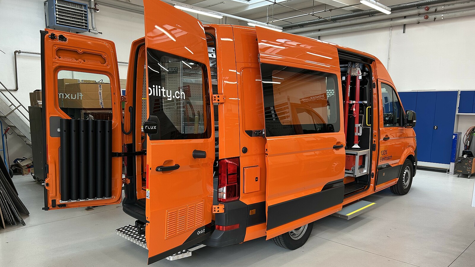 «Der erste Auftrag wartet, Werkzeug und Material sind sicher verstaut und schon geht es los. Sie drücken den Startknopf, der Motor läuft flüsterleise an. Keine Abgase, kein Lärm, kein Stress. Stattdessen volle Konzentration auf das was zählt: Ihre Arbeit und Ihre Kunden. Schon die erste Fahrt macht den Unterschied spürbar – entspanntes Gleiten durch die Stadt, freie Zufahrt in Umweltzonen und ein gutes Gefühl, weil Sie nachhaltig unterwegs sind.» Ein Einblick in die Elektroproduktion der Wenger Carrosserie/Fahrzeugbau in Basel.
